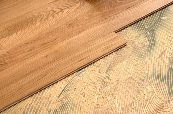 Glue down - This method is applied when installing engineered wood floors and parquets. It can be carried out upon both wooden and concrete sub-floors and as the name indicates, this technique requires mastic or adhesive, spread directly on to the sub-floor for the boards to be adhered directly to it. It is essential though, that a two part damb proof membrane is always laid if it is to be fitted on a concrete/cement subfloor. This will protect the floor from any moisture coming through the sub-floor and it will also provide a suitable surface for the adhesive to bond to.